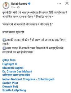 भाजपा विधायक रेणुका सिंह के बयान पर कांग्रेस के पूर्व विधायक गुलाब कमरो ने सोशल मीडिया पर पोस्ट कर कहा है कि जनता सवाल पूछ रही कि आपकी सरकार में कौन है वो रावण, जो जनता का हक निगल रहा है? अगर समाज में आपको रावण दिखता है तो बताइए वो रावण किसके संरक्षण में पल रहा है?