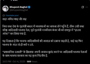 बघेल तंज कसते हुए सोशल मीडिया पर लिखा- “वाह! अमित शाह जी! वाह” जिस वक्त देश के गृहमंत्री बस्तर में व्यवस्थाओं का जायजा लेने पहुँचे हैं, ठीक उसी वक्त वरिष्ठ आदिवासी भाजपा नेता, पूर्व गृहमंत्री ननकीराम कंवर को रायपुर में हाउस अरेस्ट कर लिया गया है. यह दिखाता है कि भाजपा आदिवासियों की आवाज़ को दबाना चाहती है, चाहे वह फिर भाजपा के अंदर से ही क्यों न उठे. “प्रशासनिक दलाली” के ख़िलाफ़ अपनी आवाज बुलंद करने पर आदिवासी भाजपा नेताओं के साथ भाजपा सरकार का यह कृत्य निंदनीय है.
