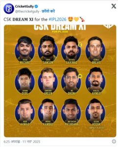 रुतुराज गायकवाड़, मथीशा पथिराना, नूर अहमद, खलील अहमद, एमएस धोनी, शिवम दुबे, शेख रशीद, अंशुल कंबोज, मुकेश चौधरी, डेवाल्ड ब्रेविस, कमलेश नागरकोटी, नाथन एलिस, वंश बेदी, आंद्रे सिद्दार्थ, श्रेयस गोपाल, आयुष म्हात्रे, उर्विल पटेल