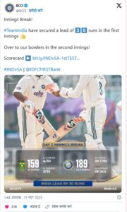 बता दें कि भारतीय कप्तान शुभमन गिल बल्लेबाजी करते हुए चोटिल हो गए थे, जिस कारण वह रिटायर्ड हर्ट होकर पवेलियन लौटे। इसके बाद वह बल्लेबाजी के लिए नहीं उतर सके, जिस कारण नौ विकेट गिरने के बाद भारत की पहली पारी समाप्त हो गई। इससे पहले दक्षिण अफ्रीका ने पहली पारी में 159 रन बनाए थे।