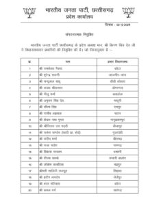 भाजपा ने नियुक्त किए विधानसभावार प्रभारी, पैकरा को कोटा, तो सवन्नी को मिली जांजगीर-चांपा की जिम्मेदारी…