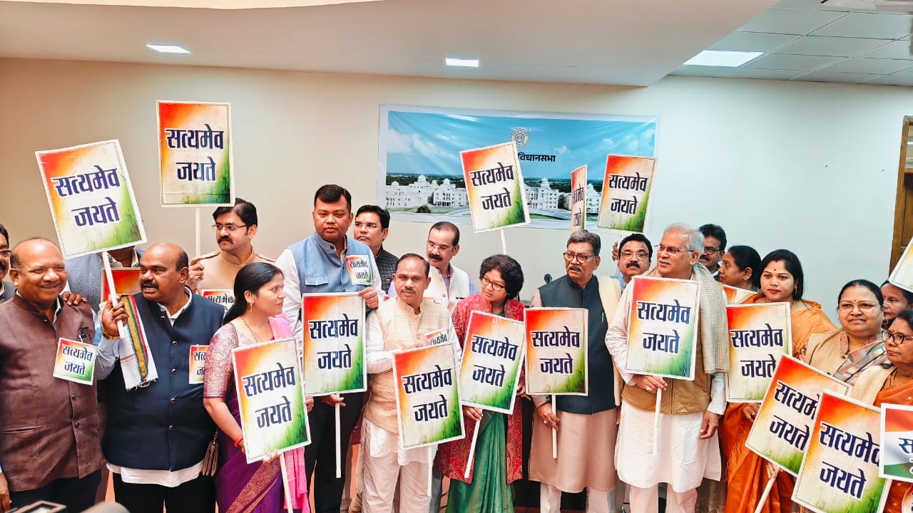 • आज छत्तीसगढ़ विधानसभा में कांग्रेस विधायक दल के नेता डॉ. चरणदास महंत के नेतृत्व में “सत्यमेव जयते” की तखती लेकर प्रदर्शन किया गया।