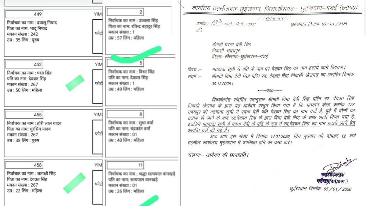 मामले की शुरुआत 30 दिसंबर 2025 को हुई, जब रानी विभा सिंह ने कलेक्टर खैरागढ़ कार्यालय में लिखित शिकायत देकर आरोप लगाया कि SIR प्रक्रिया के दौरान दिवंगत पूर्व विधायक एवं सांसद राजा देवव्रत सिंह की वैवाहिक स्थिति को लेकर गंभीर त्रुटि की गई है. शिकायत में कहा गया कि उनकी तलाकशुदा पूर्व पत्नी पद्मा सिंह, जो वर्तमान में नितिन पंत की पत्नी हैं, उन्हें फिर से राजा देवव्रत सिंह की पत्नी के रूप में मतदाता सूची में दर्ज कर दिया गया, जबकि तलाक के बाद राजा देवव्रत सिंह का विवाह रानी विभा सिंह से हुआ था.