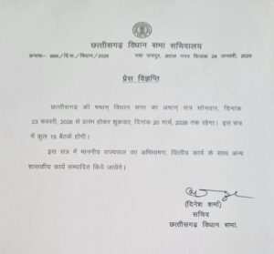 - छत्तीसगढ़ विधानसभा सत्र की अधिसूचना जारी, 23 फरवरी से 20 मार्च तक होंगी 15 बैठकें…