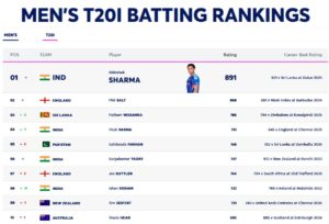 ICC T20I रैंकिंग में भारतीय सलामी बल्लेबाज अभिषेक शर्मा अभी भी नंबर-1 पर बरकरार हैं। इंग्लैंड के फिल साल्ट दूसरे स्थान पर हैं। श्रीलंका के विस्फोटक बल्लेबाज पथुम निसंका ने ऑस्ट्रेलिया के खिलाफ शानदार शतक के दम पर तीन स्थान ऊपर छलांग लगाई और तीसरे नंबर पर पहुंच गए। वहीं, तिलक वर्मा ने भी एक पायदान ऊपर चढ़कर चौथे स्थान पर कब्जा जमाया।