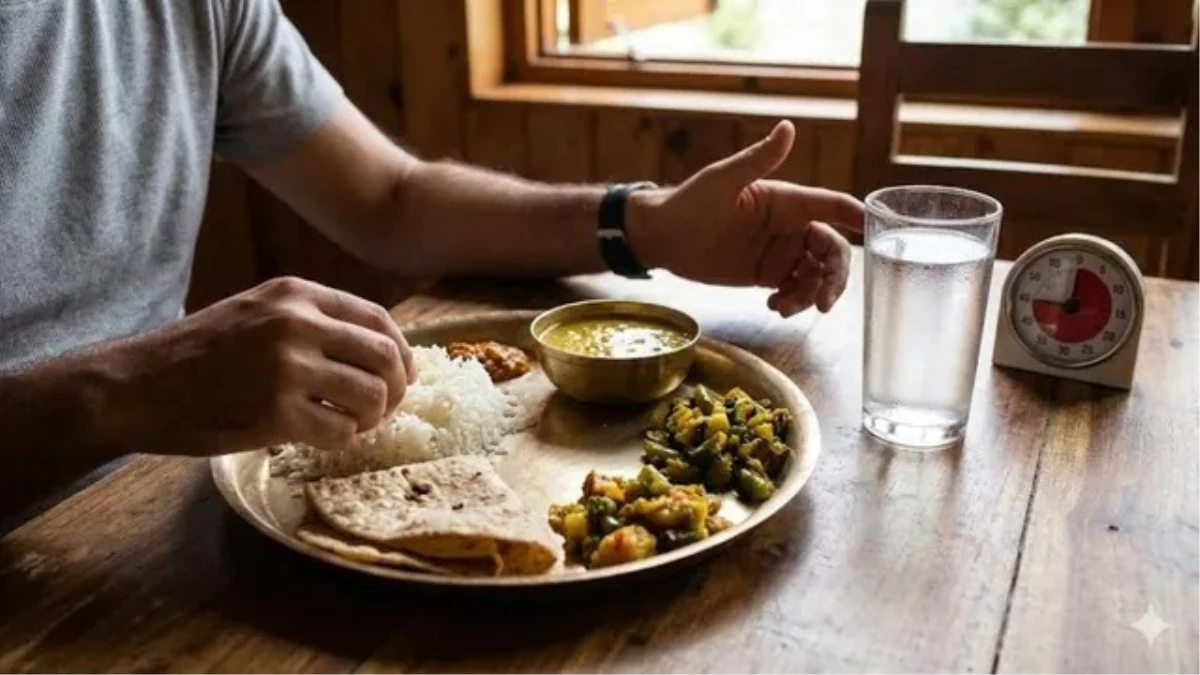 • जरूरत पड़ने पर: यदि भोजन के दौरान गला सूख रहा हो या तीखा लग रहा हो, तो एक-दो घूंट गुनगुना पानी या छाछ का सेवन किया जा सकता है।